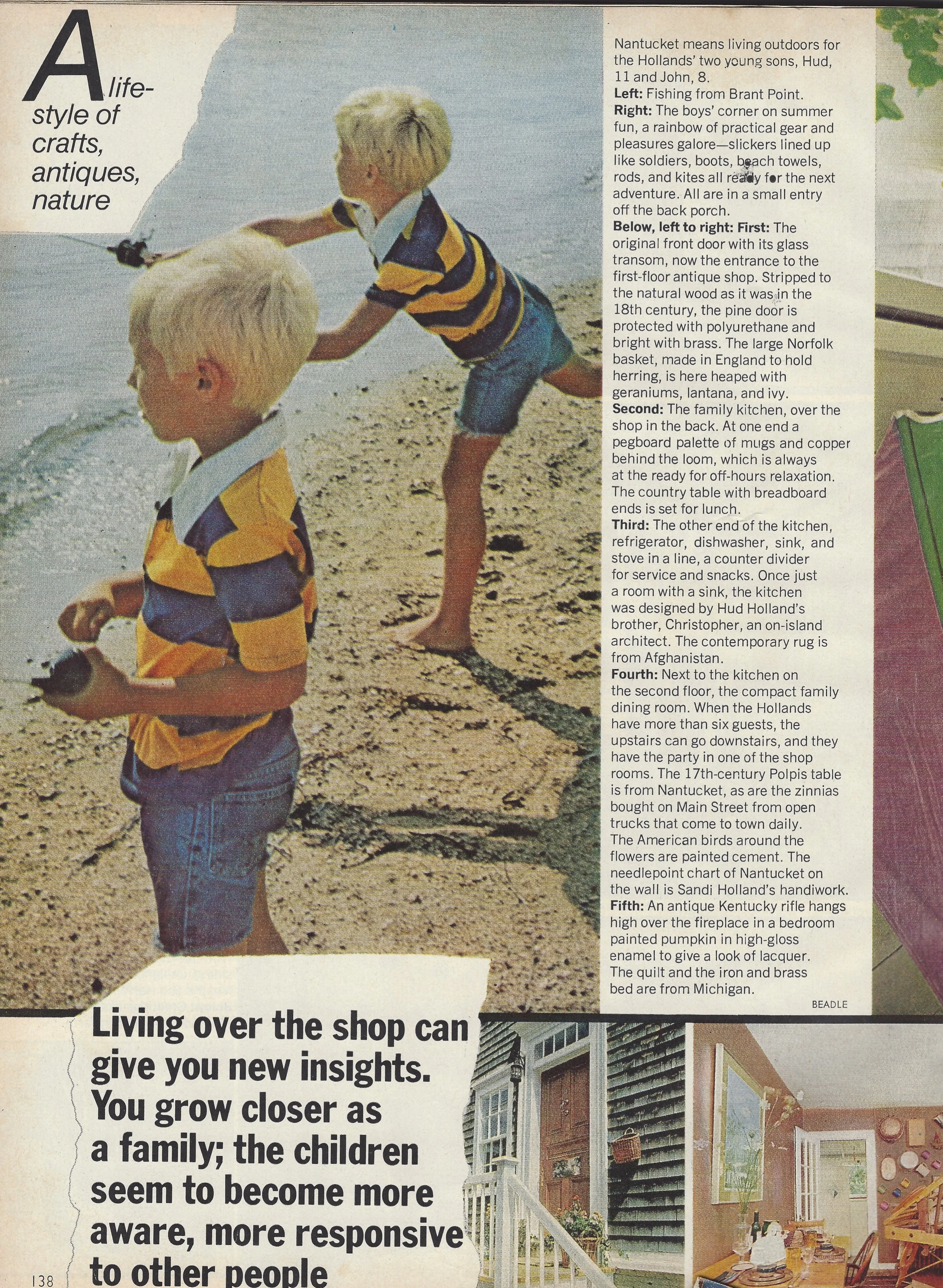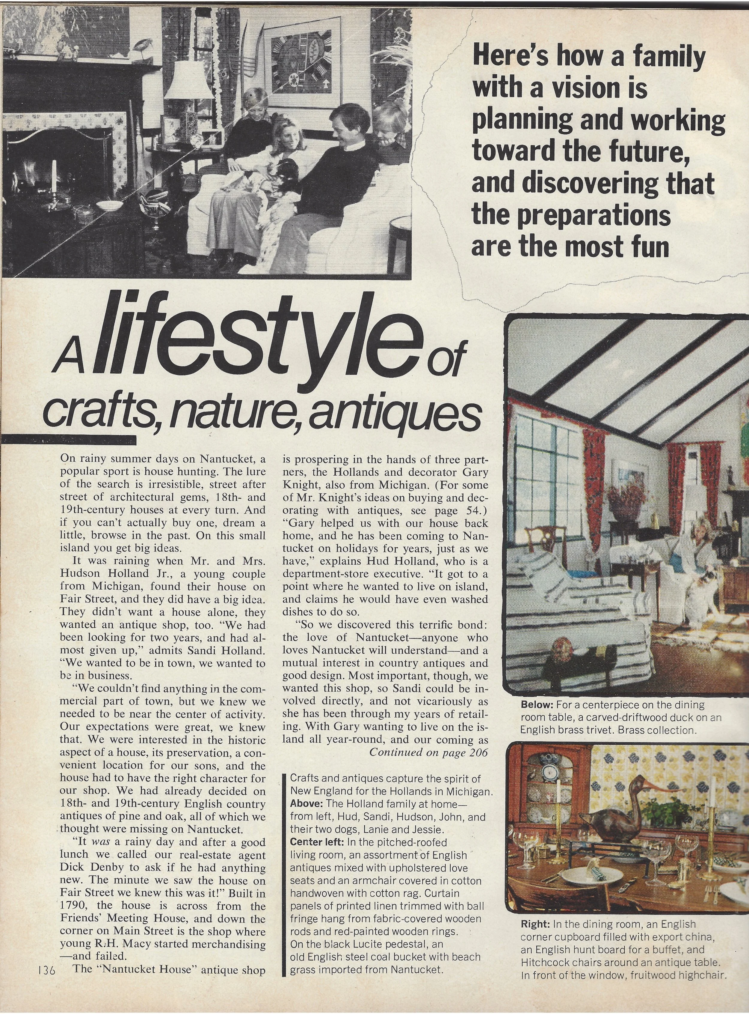 In 1973, department store executive Hudson “Huddy” Holland and his designer wife, Sandi opened a small antique shop on the first floor of 8 Fair Street in what was then the remote, un-trendy island of Nantucket. In 1978, they made a wholesale move from suburban Michigan to Nantucket with their two young boys. Nantucket House Antiques and Interior Design soon set up shop at 2 South Beach Street, where it still resides and established itself as the first design firm of its kind on Nantucket.